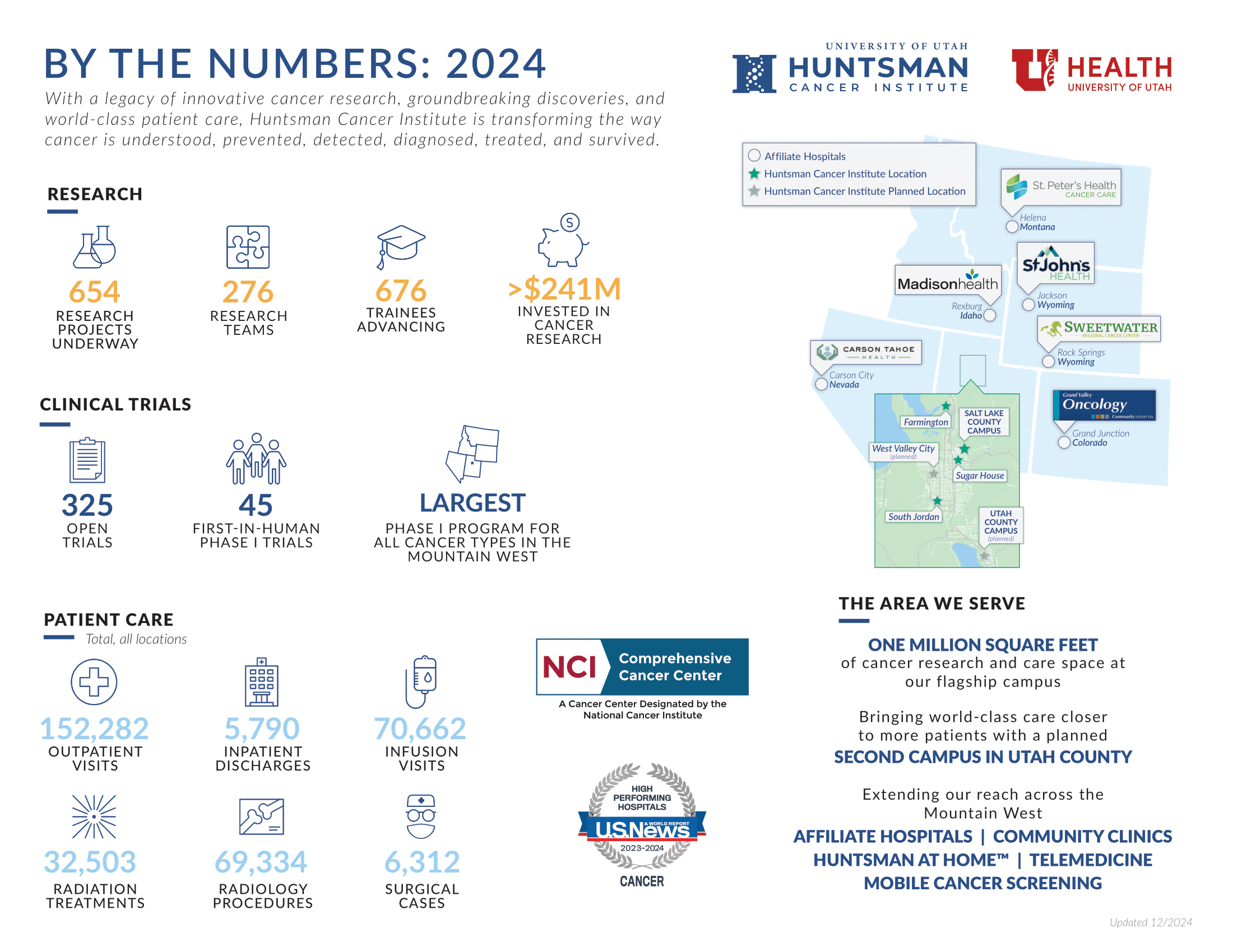 Huntsman Cancer Institute at the University of Utah is a nationally recognized cancer center serving patients across the Mountain West. With multiple locations, telemedicine, mobile screening, and partnerships with regional hospitals, Huntsman Cancer Institute brings specialized cancer care closer to patients.